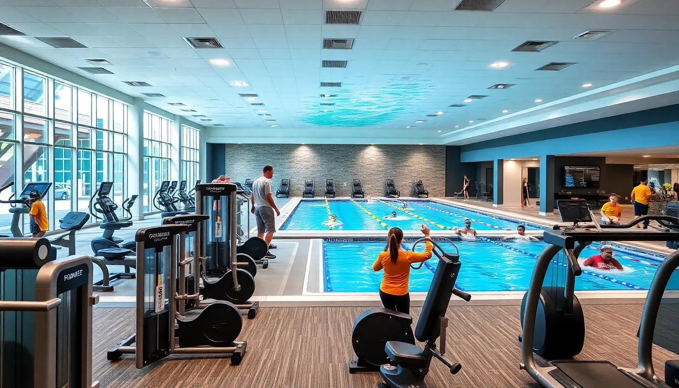 Group fitness options include cycling, yoga, and high-intensity interval training. Personal training services help individuals achieve specific health goals with tailored plans. The facility also features a spacious swimming pool for lap swimming and aquatic exercise.